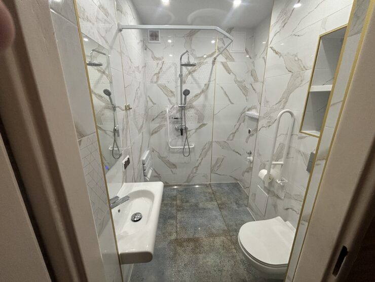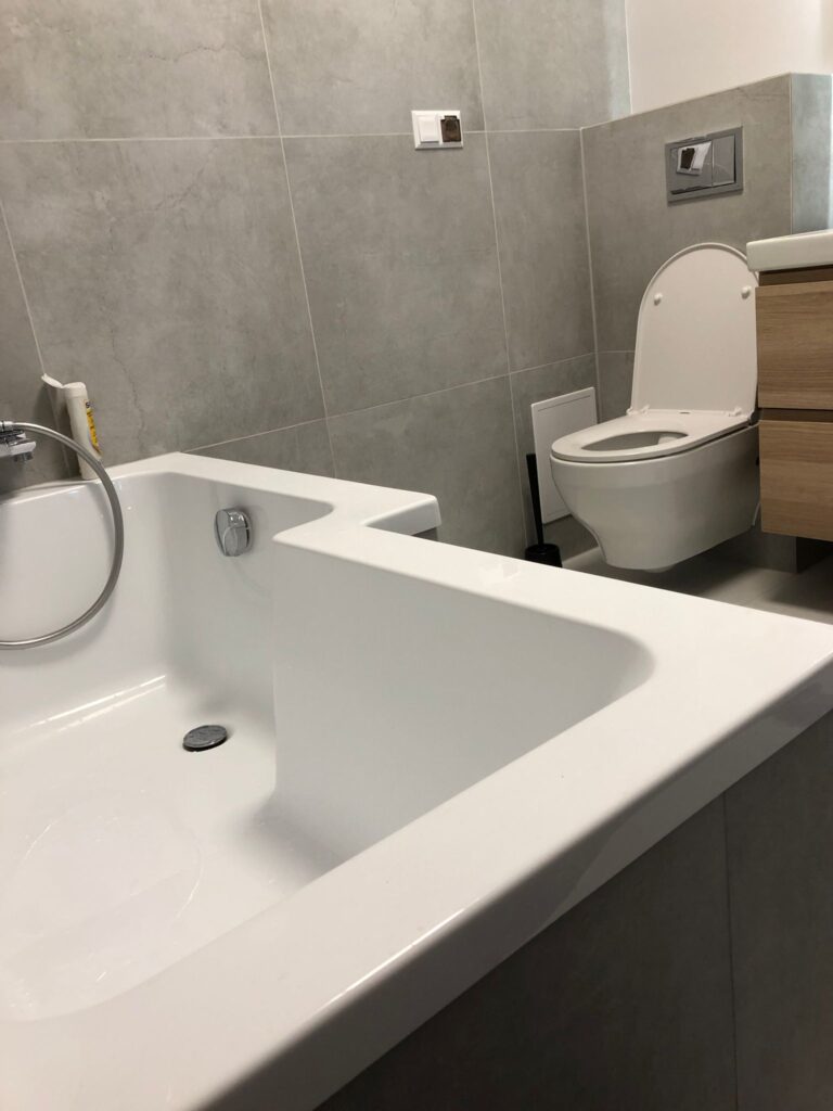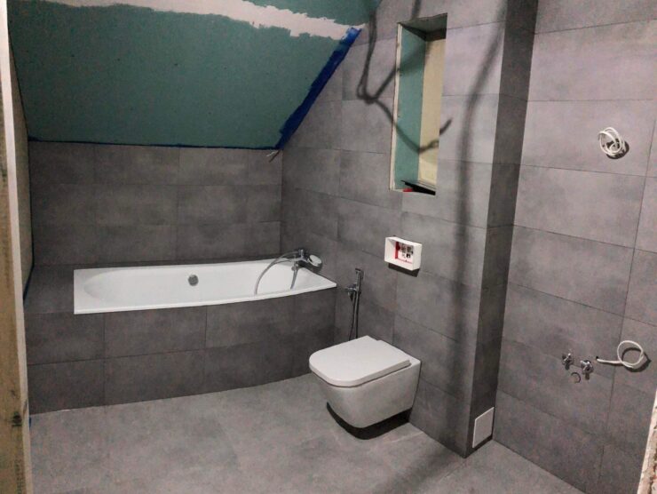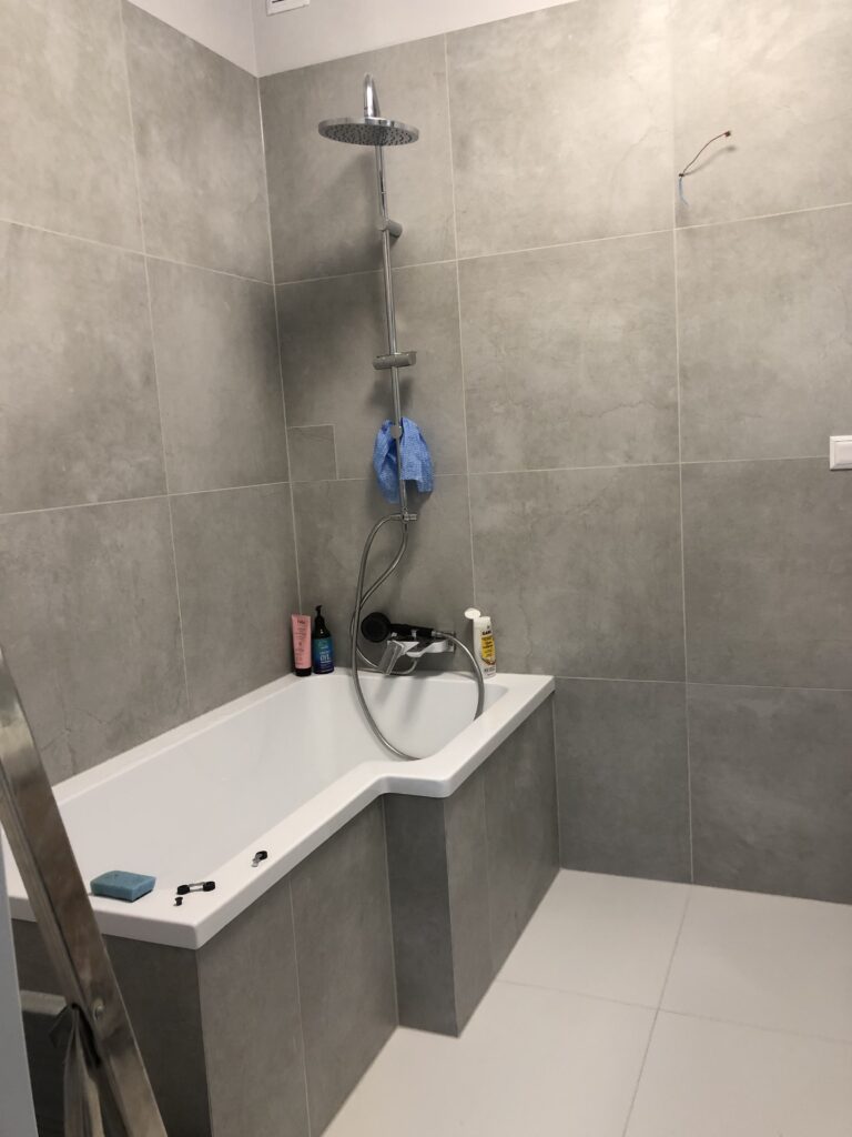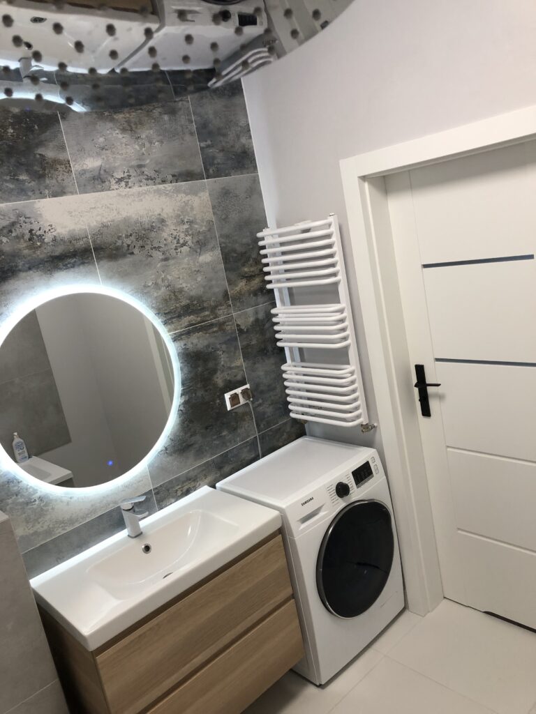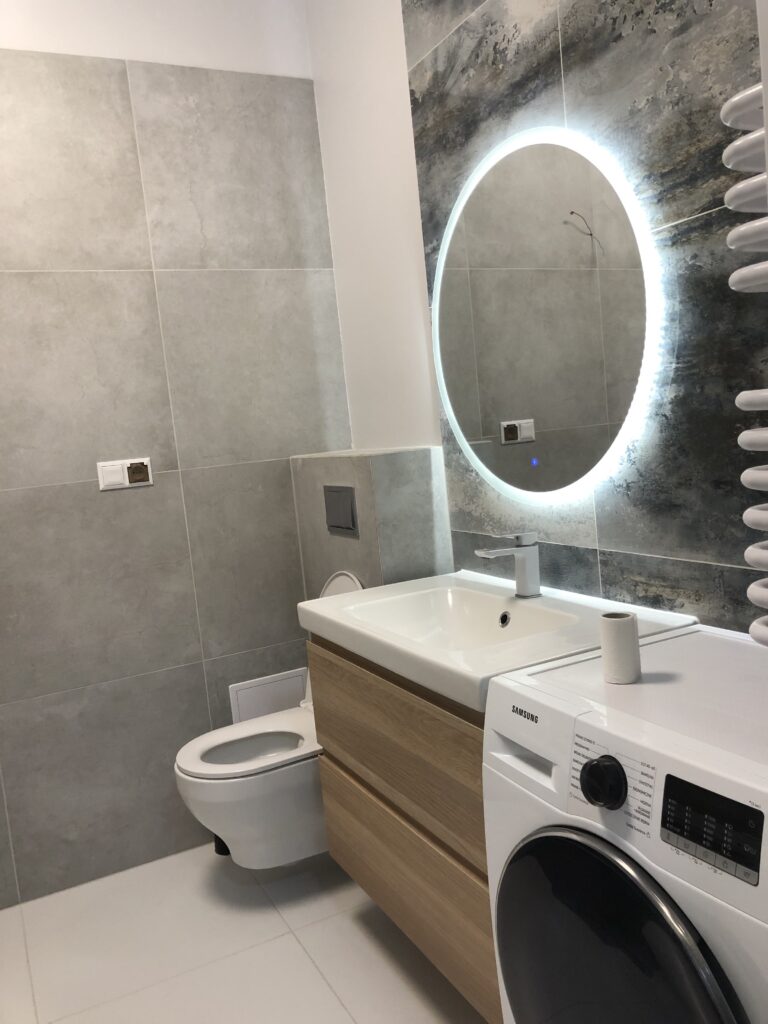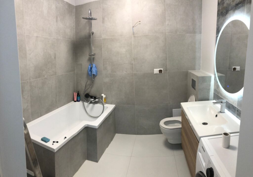 Projekt ten obejmował usunięcie starych powłok, wymianę instalacji hydraulicznej, elektrycznej, grzewczej, kanalizacyjnej, budowę ściany maskującej, wykonanie sufitu podwieszanego, układanie płytek gresowych w 3 wzorach, płytki z docięciem 45 stopni, wykonanie maskujących rewizji do zaworów gazowych, odpływów, montaż armatury.
